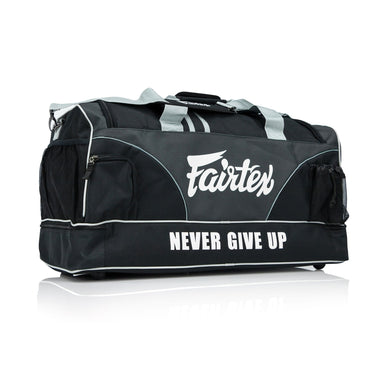 The Fairtex Gym Bag in Black/Gray offers a stylish and practical solution for combat sports athletes. Its roomy interior accommodates all your training gear, including gloves, shin guards, headgear, and shoes. A dedicated wet compartment prevents moisture from affecting dry items, while the lockable premium zipper ensures security. Designed for durability and everyday use, this two-tone bag measures 13" × 28" × 14" (33cm × 71cm × 36cm) and provides about 83.5 liters of storage, making it p...